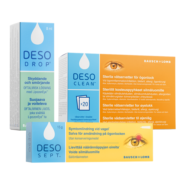 DESODROP (8 ml) -silmätippa on tarkoitettu silmän pinnan tulehdusten ja infektioiden oireiden lievittämiseen sekä paranemisen tukemiseen. DESOSEPT (15 g) on silmäluomille tarkoitettu voide, joka auttaa lievittämään kutinaa sekä näärännäpyn tai luomirakkulan aiheuttamaa arkuutta ja turvotusta. DESOCLEAN (20 kpl) on steriili silmäluomien päivittäiseen puhdistukseen tarkoitettu kosteuspyyhe, joka auttaa kosteuttamaan ja rauhoittamaan ihoa silmätulehduksissa, allergiassa sekä ennen ja jälkeen silmäleikkauksen. Kaikki tuotteet ovat säilöntäaineettomia.