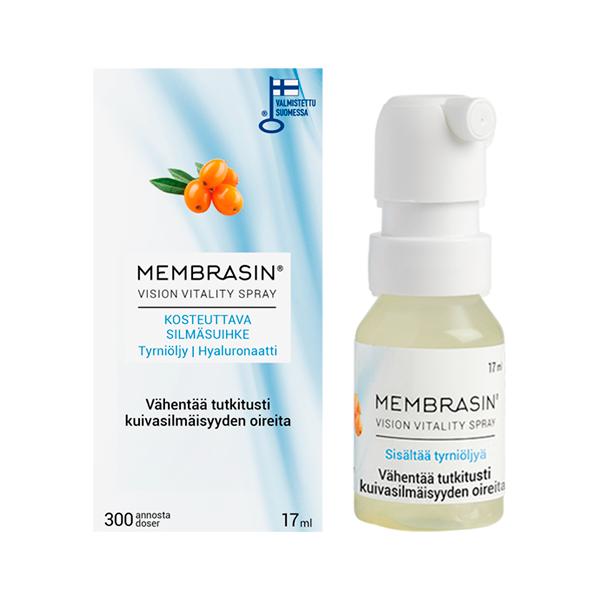MEMBRASIN® VISION VITALITY SPRAY (17 ml) on alkoholiton ja säilöntäaineeton silmäsuihke kuivien silmien oireisiin. Suomessa valmistettu tyrniöljy vahvistaa silmän lipidikalvoa ja hyaluronaatti auttaa sitomaan kosteutta. Helppokäyttöinen suihke kosteuttaa silmäluomia ja silmänympärysihoa, lievittää epämukavuutta ja sopii päivittäiseen käyttöön myös meikin ja piilolinssien kanssa.