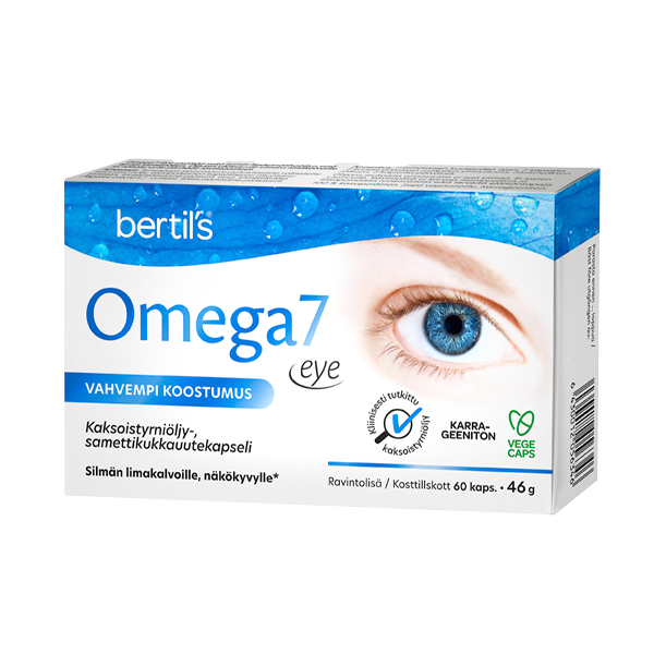 BERTIL ́S OMEGA7 EYE (60 kaps.) on silmien tarpeisiin räätälöity valmiste, joka yhdistää kliinisesti tutkitun kaksoistyrniöljyn ja entistä vahvemman määrän luteiinia, zeaksantiinia sekä uuden polven mesozeaksantiinia. Vegaaniset ja karrageenittomat kapselit sopivat erinomaisesti kuiville, vuotaville tai väsyneille silmille sekä esimerkiksi paljon näyttöpäätetyötä tekeville.