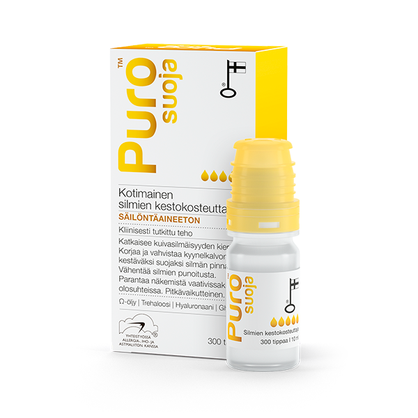 PUROTM SUOJA (10 ml) on säilöntäaineeton kuivasilmäisyyden oireiden ja vaurioiden hoitamiseen sekä ehkäisemiseen tarkoitettu pitkävaikutteinen lipidiemulsiosilmätippa. Säilöntäaineeton tuote vähentää silmien vuotamista sekä korjaa vaurioita ja vähentää silmänpinnan punoitusta. Sopii käytettäväksi piilolinssien kanssa eikä linssejä tarvitse poistaa silmistä.