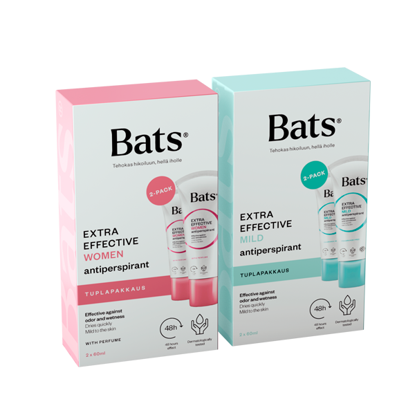 BATS ANTI-PERSPIRANTTI 2-PACK on hellävarainen antiperspirantti tuplapakkauksessa. Antiperspirantti vähentää hikoilua ja antaa pitkäkestoisen kuivan tunteen. Tuote ehkäisee tehokkaasti hikoilua ja pitää kainalot kuivina koko päivän. Antaa luotettavan suojan myös treeniin.