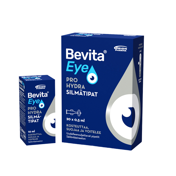 BEVITA EYE PRO HYDRA (10 ml plo ja 20 x 0,5 ml pipetit) on tarkoitettu lievän ja keskivaikean kuivasilmäisyyden hoitoon. Patentoitu hyaluronihappoa ja TS-polysakkaridia sisältävä nelivaikutteinen koostumus kosteuttaa, suojaa, voitelee ja tasapainottaa pitkäaikaisesti. Yhteensopiva pehmeiden piilolinssien kanssa. Uutuus on säilöntäaineeton ja fosfaatiton. Annostelu: 1 tippa kumpaankin silmään tarpeen mukaan kahdesti päivässä tai useammin. Lääkinnällinen laite.