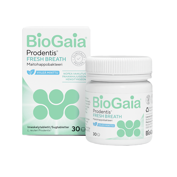 BIOGAIA PRODENTIS FRESH BREATH on maitohappobakteeri-sinkkitabletti pahanhajuiseen hengitykseen. Sinkki neutraloi pahanhajuista hengitystä aiheuttavia yhdisteitä, kun taas patentoidut maitohappobakteerit auttavat vähentämään hajua aiheuttavia bakteereja ja tukevat suun luonnollista bakteeritasapainoa. Viilentävä tuote maistuu mintulta. Ei sisällä keinotekoisia makeutusaineita tai aromeja.