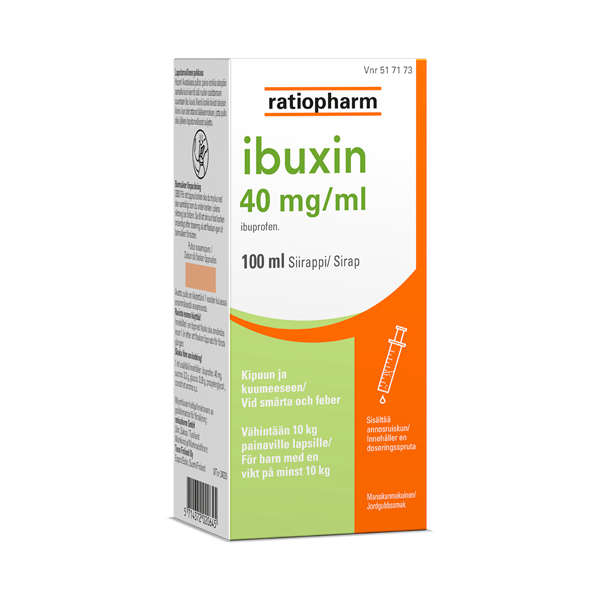 Ibuxin 40 mg/ml siirappi lievän tai kohtalaisen kivun sekä kuumeen lyhytaikaiseen, oireenmukaiseen hoitoon. Vaikuttava aine on ibuprofeeni. Sopii vähintään 1 vuoden ikäisille, vähintään 10 kg painaville lapsille, nuorille ja aikuisille. Neuvottele lääkärin kanssa, jos sairastat maha- tai pohjukaissuolihaavaa, sinulla on ilmennyt yliherkkyyttä muiden särkylääkkeiden käytön yhteydessä tai olet raskaana. Tutustu huolella pakkausselosteeseen.