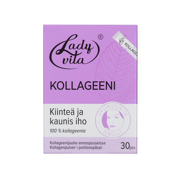 LADYVITA KOLLAGEENIJAUHE (30 annos-pss.) on neutraalin makuinen ja käyttövalmis annosjauhe, joka on helppo sekoittaa veteen, muuhun nesteeseen tai ruokaan. Sisältää 100 % VERISOL -kollageenia. Ei sisällä väri- tai makuaineita eikä vitamiineja tai mineraaleja. Kliiniset tutkimukset osoittavat, että VERISOL auttaa vähentämään ryppyjä sekä parantamaan ihon joustavuutta 2 500 mg:n päiväannoksella.