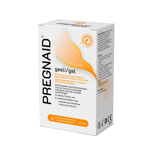 PREGNAID-emätingeeli (6 x 0,5 ml) tukee hedelmällisyyttä pareilla, joilla on vaikeuksia tulla raskaaksi. Se luo optimaalisen ympäristön ja pH:n ja muuttaa osmolalisuuden siemennesteelle sopivaksi. Käyttöä suositellaan kierron hedelmällisimpinä päivinä (13.–15.). Valmiste ei sisällä silikonia eikä parabeeneja. Lääkinnällinen laite.