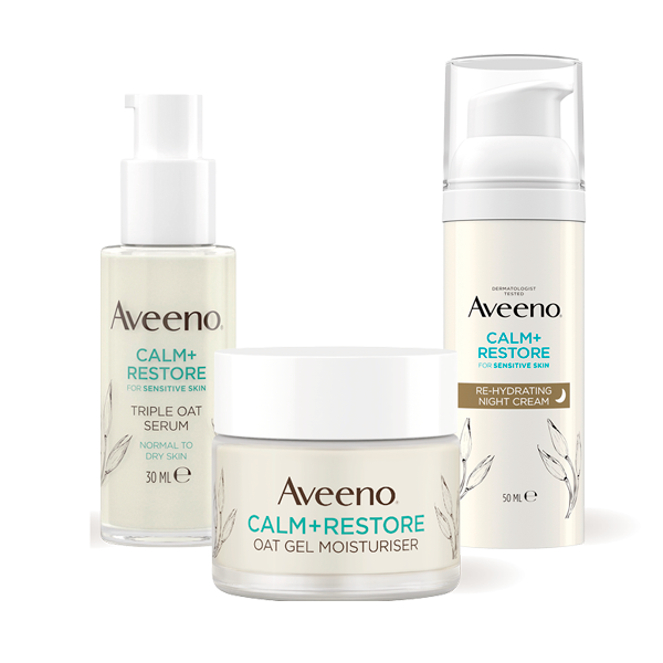 AVEENO CALM+ RESTORE -kasvojenhoitotuotteet sopivat normaalille ja kuivalle iholle. Sarjan kosteusvoide, yövoide ja seerumi auttavat kosteuttamaan ja rauhoittamaan herkkää ihoa. Ne sisältävät kauraa, jonka tiedetään auttavan rauhoittamaan ja korjaamaan ihoa, sekä reunuspietaryrttiä, joka tukee rauhoittavia ja antioksidanttisia ominaisuuksia.