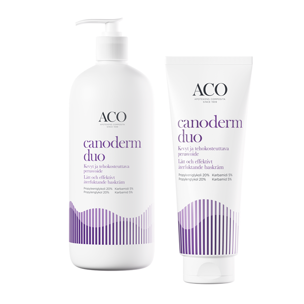 CANODERM DUO (210 ja 730 g) on kevyt koko perheen perusvoide, joka helpottaa kuivaa ja kutisevaa ihoa. Koostumus sisältää yhdistelmän 20 % propyleeniglykolia ja 5 % karbamidia, jotka auttavat sitomaan kosteutta ihoon, vahvistamaan ihon läpäisyestettä ja tukemaan ihon luonnollista mikrobiomia. Hajusteeton voide levittyy helposti. Normaalille, kuivalle ja atooppiselle iholle, myös rasvoittuvalle iholle.