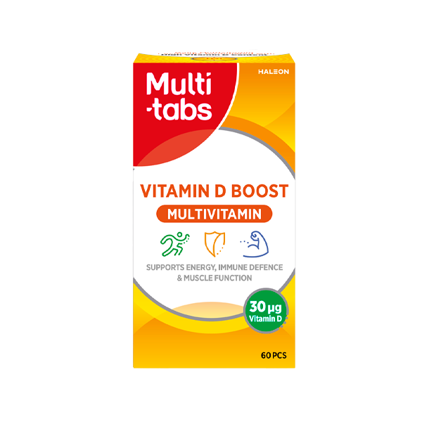 MULTI-TABS VITAMIN D BOOST (60 kpl) -monivitamiini sisältää runsaasti D-vitamiinia, joka auttaa tukemaan immuunijärjestelmän normaalia toimintaa pimeän talvikauden aikana. Yksi tabletti sisältää 30 μg D-vitamiinia sekä muita vitamiineja ja kivennäisaineita, kuten B6-, B12- ja C-vitamiinia, jotka auttavat edistämään normaalia energia-aineenvaihduntaa sekä vähentämään väsymystä ja uupumusta. Ravintolisää ei tule käyttää monipuolisen ruokavalion korvikkeena.
