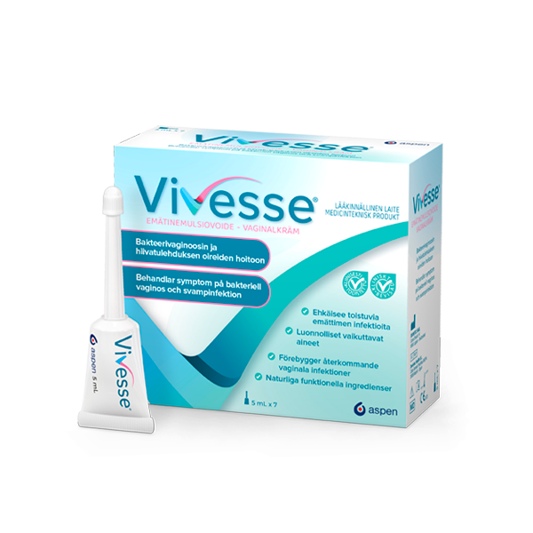 VIVESSE auttaa hoitamaan bakteerivaginoosin ja emättimen hiivatulehduksen oireita muodostamalla suojaavan kalvon emättimen limakalvolle sekä palauttamalla emättimen normaalin pH-arvon. Hormoniton tuote sisältää kolmea luonnollista vaikuttavaa ainetta: maitohappoa, herneproteiinia ja viinirypäleensiemenuutetta. Voidaan käyttää yhdessä sienilääkehoitojen kanssa sekä apuna emätintulehdusten uusiutumisen ehkäisyssä.